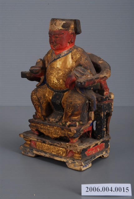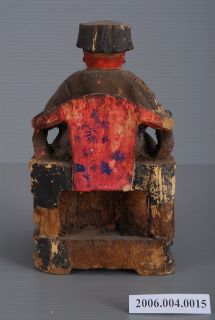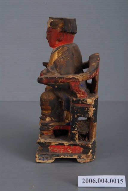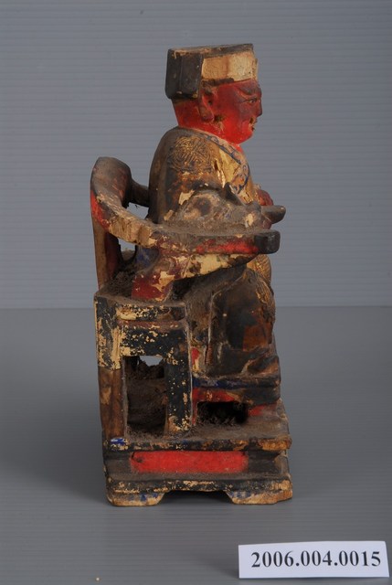土地公又稱福德正神,部分地區也稱為伯公、后土、社神、土地神等。土地公傳說眾多,一般人生前行善,死後亦有被封為土地公者。土地公不僅掌一境之地,也被視為是文財神。本件土地公頭戴冠帽,身穿鶴紋朝服,右手拿金元寶,左手放置在圈椅扶手上。腳踏及底座皆有描金紋飾。圈椅後背漆為紅色,椅身為黑色,椅座漆層部分脫落。