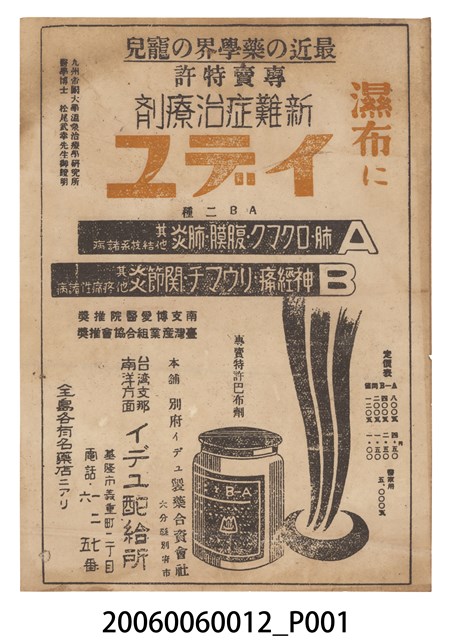 1. 本物件為基隆市義重町二丁目藥品廣告。此廣告為イデユ擁有專賣特許,廣告名稱為最近藥學界之寵兒,標榜新難症治療劑。該劑分為AB兩種。A種為治療肺炎、腹膜、其他結核系諸病;B種治療神經痛、關節炎、其他疼痛性諸病。有九州帝國大學溫泉治療學研究所醫學博士松尾武幸先生御證明,並有南支博愛醫院以及臺灣產業組合協會推薦。本舖別府イデユ製薬合資會社在大分縣別府市,イデユ配給所在基隆市義重町二丁目。
