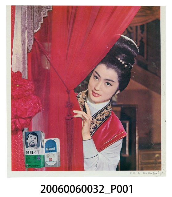 1.本物件為發胖-BT影星秦萍。圖片為秦萍身穿古裝,從紅色布簾後方探出頭。左下角有發胖-BT和益敏朗產品圖片。圖片最下方有秦萍小姐和Miss Chyn Pyng字樣。 2.秦萍(1949-2017),原名陳小平,香港1960年代電影演員。1961年考入邵氏的南國實驗劇團第一期培訓班,後加入邵氏兄弟有限公司,代表作為《血手印》、《萬花迎春》等。