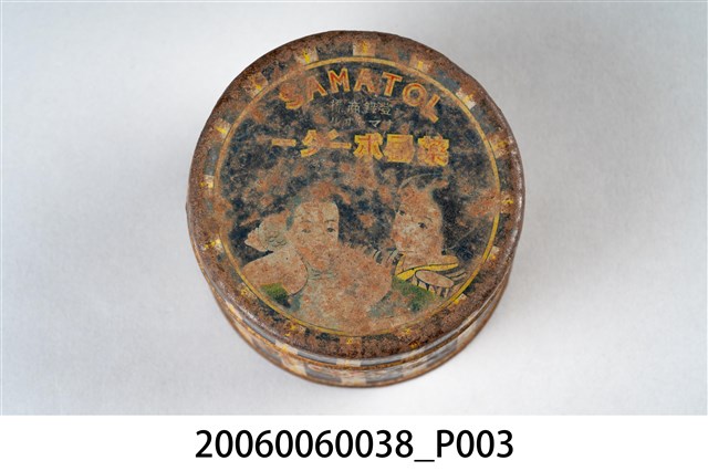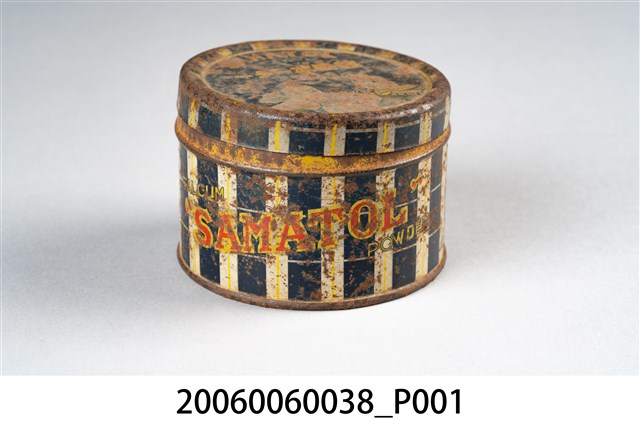 本文物薩瑪托(原文:SAMATOL)藥用爽身粉罐,整體為藍白條紋相間之圓柱體,並分為上蓋與罐體兩個部件。上蓋寫有「SAMATOL」、「登陸商標サマトオル」應為該產品的商標與品名。蓋上背景為藍底,並畫上一名母親拿著粉撲拍小孩之貌。罐身與上蓋設計相似,同樣為藍白相間條紋。爽身粉為滑石製作,洗澡完後使用,被認為有護理皮膚、預防痱子的功效。臺灣最早的科學配方爽身粉為1906年和光堂爽身粉,與傳統的天瓜粉(天花粉)相比,成為摩登、流行的象徵。1991年開始美國對於滑石粉的使用進行許多研究,並質疑爽身粉的滑石成分導致女性乳癌並影響生殖器及子宮隔膜,至今爽身粉的使用對女性和嬰兒的影響仍備受爭議。