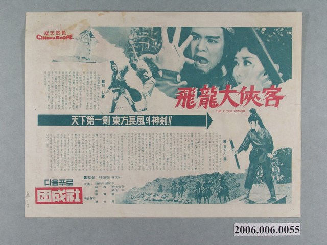 本件保存良好,彩色印刷,為飛龍大俠客電影本事。電影由韓湘琴、唐威主演,導演為徐天榮。