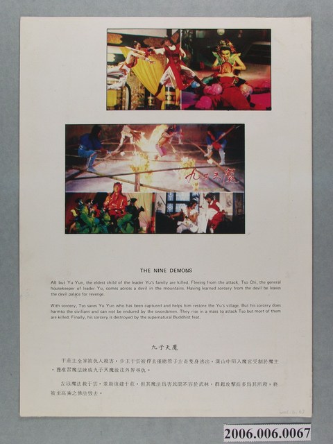 本件保存良好,彩色印刷,為九子天魔電影本事。電影由江生、鹿峰主演,導演為張徹,東大影業公司出品。