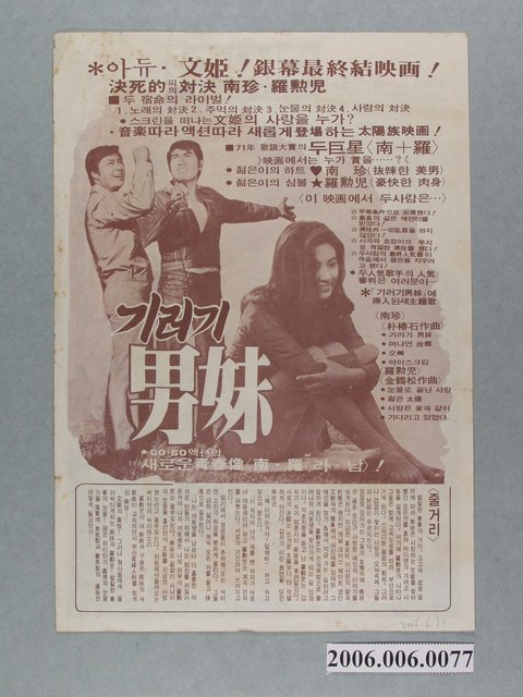 電影本事《男妹》直幅紅藍雙色印刷,外觀保存良好。電影由文姬、南珍、羅勳兒主演,導演崔寅炫 。背面為《男妹》電影韓文版本事與電影宣傳,棕色印刷。