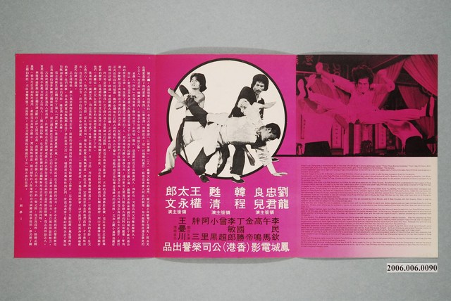 電影本事《怪拳怪招破絕招》三折頁彩色印刷,外觀保存良好,電影由 劉忠良、龍君兒主演,導演張智超。含製作群中英文版名單及劇照。內面為桃紅、黑雙色印刷,含中英文版電影本事及演員名單,由香港鳳城電影出品。