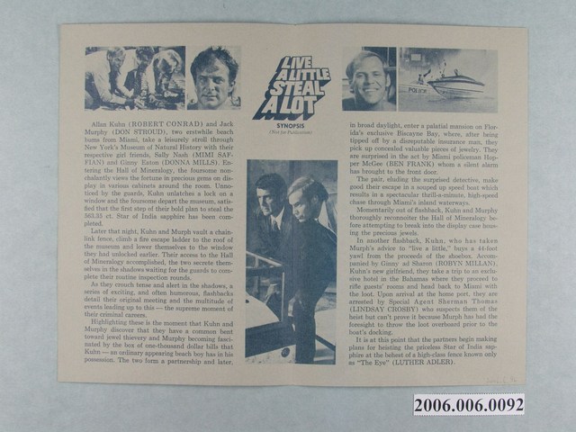 電影宣傳單《LIVE A LITTLE STEAL A LOT》封面封底皆直幅藍色印刷,外觀保存良好。電影由 Robert Conrad、Don Stroud主演,導演 Marvin J. Chomsky。封面為劇照,封底為英文製作群和演員名單。內頁為《LIVE A LITTLE STEAL A LOT》電影英文版本事,藍色印刷。