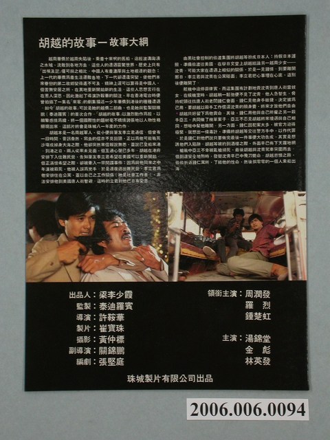 1.本物件為胡越的故事簡介,紙質文物。由物件正面上方可見導演為「許鞍華」,領銜主演為「鍾楚紅、羅烈、周潤發」,監製為「泰迪羅賓」,出品為「梁李少霞」。物件正面下方可見「胡越的故事」紅色字樣、4張電影劇照。物件背面可見電影故事大綱、2張劇照、主要工作人員名單、領銜主演及主演名單、「珠城製片有限公司出品」字樣。物件內頁可見劇照及英文簡介。