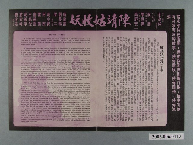 本件保存良好,雙面彩色印刷,為陳靖姑收妖電影本事,由唐寶雲、劉長鳴、梁二主演,導演余漢祥。
