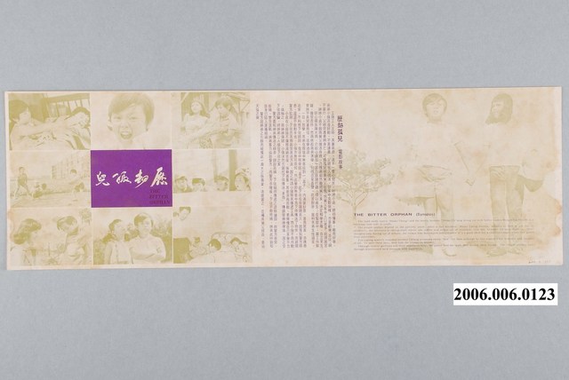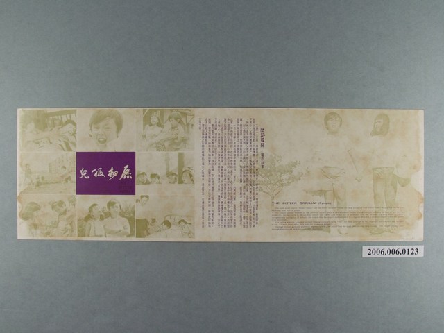 本件保存良好,雙面彩色印刷,為歷劫孤兒電影本事,由金延勳、紀寶如主演,導演余漢祥。