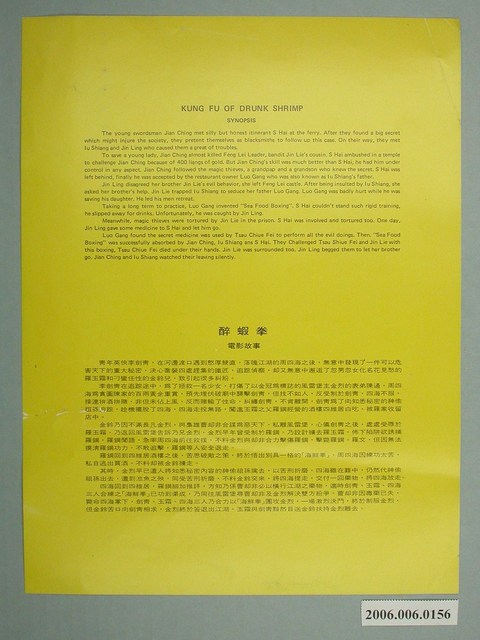 本件保存良好,雙面彩色印刷,為醉蝦拳電影本事。