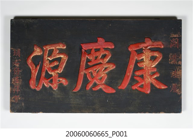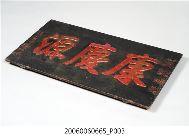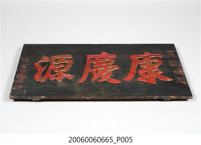 1.本件為埔心仔庄贈「康慶源」商號木匾,上款「開業誌慶」,中為三字匾詞「康慶源」,下款「埔心仔庄拜賀」。