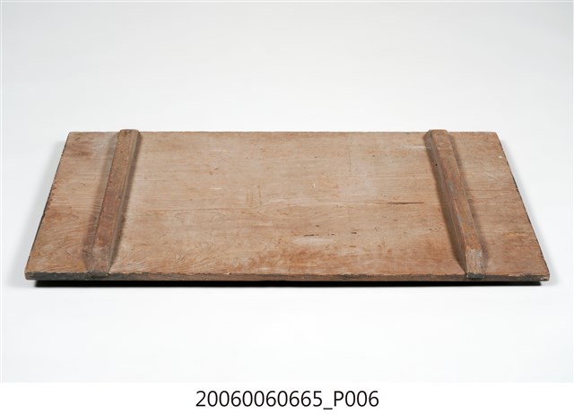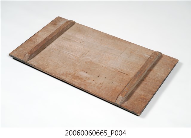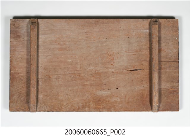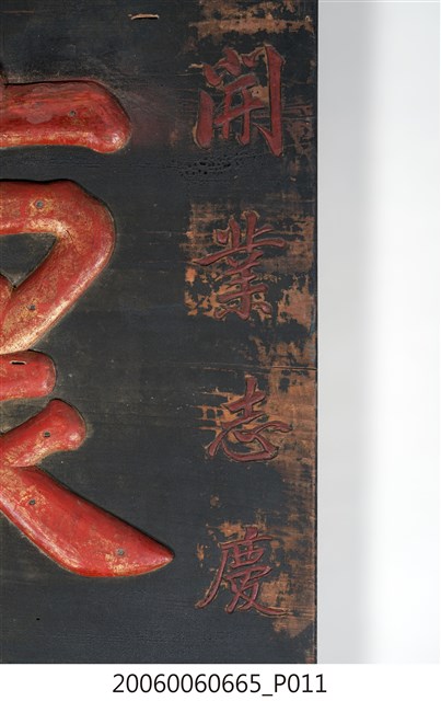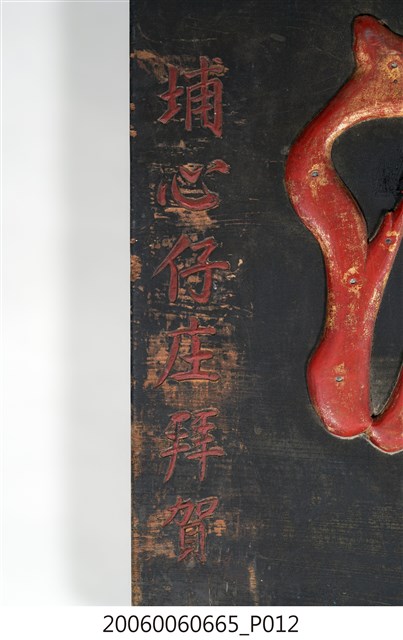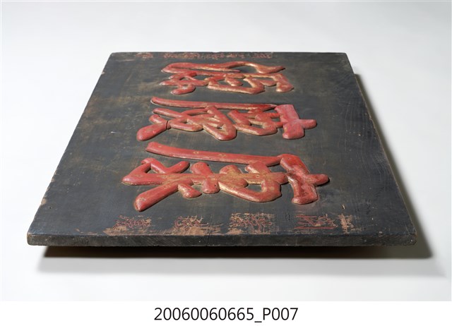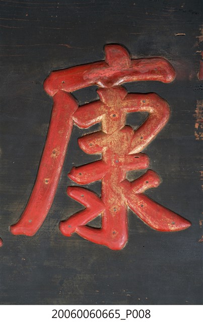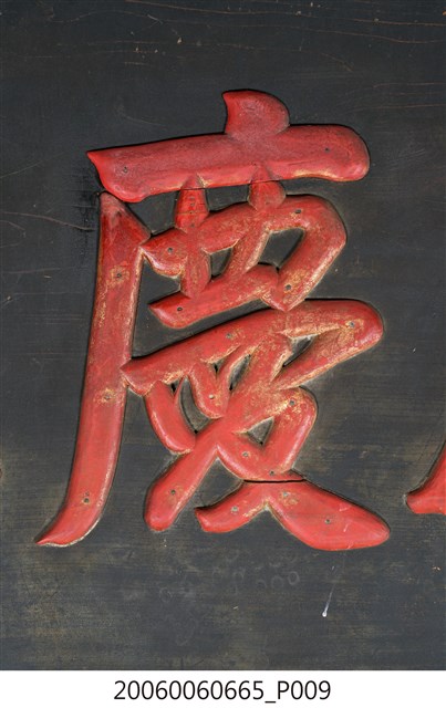 2.匾額為單一木頭製成,背後有兩木條用以固定,正面整體上黑漆,背面不上漆,匾詞與上下款文字填以紅彩,整體給人簡約但對比強烈之感。上下款文字為陰刻行書,中間匾詞則為陽文,用釘子固定在本體木板之上,文字上可見釘眼,通體有使用痕跡,上下款文字附近黑漆有部分剝落,匾詞慶字木片下端有裂痕。