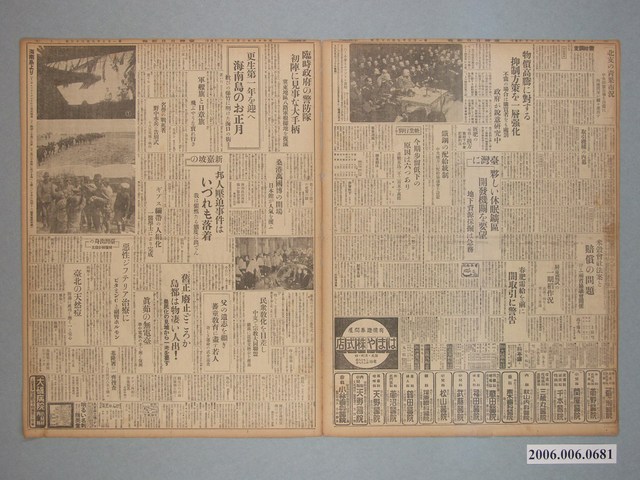 此為一紙質報刊,為1939年(昭和14年)2月20日由臺灣日日新報社發行的《臺灣日日新報》第13983號第1、2、7、8版。此物件代表的《臺灣日日新報》為臺灣日治時期,日本官方立場的報紙,也被稱為總督府的「御用報紙」。 此物件代表的《臺灣日日新報》為臺灣日治時期創辦,並偏向日本官方立場的報紙,也被稱為總督府的「御用報紙」。《臺灣日日新報》並非日治時期最早創辦的報紙,是由1896創辦的《臺灣新報》以及1897年創辦的《臺灣日報》合併而成。其後《臺灣日日新報》與《臺南新報》、《臺灣新聞》共三報被合稱「臺灣三大御用新聞」,同時也是臺灣當時最大的報社,最終在日治末期的1944年將臺北《臺灣日日新報》、《興南新聞》、臺中《臺灣新聞》、臺南《臺灣日報》、高雄《高雄新報》、花蓮《東臺灣新報》五大報合併為《臺灣新報》,而在戰後《臺灣新報》被國民政府接收改為《臺灣新生報》。(何義麟,2015:26-27)