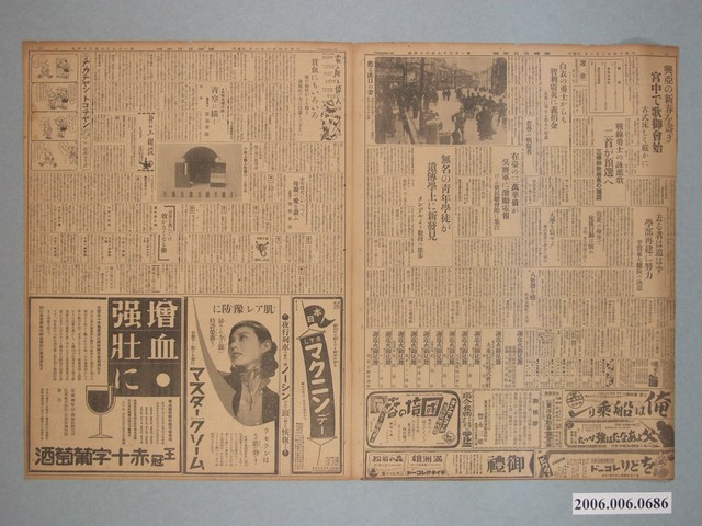 此為一紙質報刊,為1939年(昭和14年)2月1日由臺灣日日新報社發行的《臺灣日日新報》夕刊第13964號第1、2、3、4版。此物件代表的《臺灣日日新報》為臺灣日治時期,日本官方立場的報紙,也被稱為總督府的「御用報紙」。 此物件代表的《臺灣日日新報》為臺灣日治時期創辦,並偏向日本官方立場的報紙,也被稱為總督府的「御用報紙」。《臺灣日日新報》並非日治時期最早創辦的報紙,是由1896創辦的《臺灣新報》以及1897年創辦的《臺灣日報》合併而成。其後《臺灣日日新報》與《臺南新報》、《臺灣新聞》共三報被合稱「臺灣三大御用新聞」,同時也是臺灣當時最大的報社,最終在日治末期的1944年將臺北《臺灣日日新報》、《興南新聞》、臺中《臺灣新聞》、臺南《臺灣日報》、高雄《高雄新報》、花蓮《東臺灣新報》五大報合併為《臺灣新報》,而在戰後《臺灣新報》被國民政府接收改為《臺灣新生報》。(何義麟,2015:26-27)
