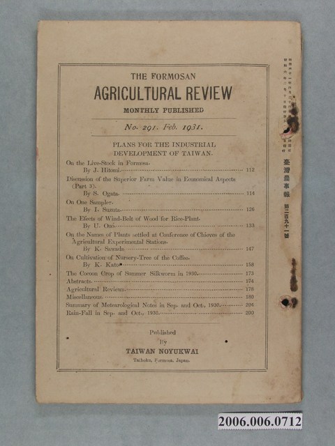1.本物件為1931年發行的《臺灣農事報》第27年第2號刊物。封面上半部由上而下依序橫印「明治三十八年五月創刊」、「臺灣農事報」、「昭和六年二月」等4排刊名資訊;封面中央為主要目次;目次上方橫印「第27年 第2號」字樣;封面最下方橫印「臺灣農友會發行」字樣。封面中間區塊是詳細目錄,目錄裡分為7個部分,首先是「卷頭言」不知撰人所撰寫題為〈霧社事件に直面して感深きものあり〉;其次是包括「論說」、「研究調查」及「統計」共7篇的調查研究論文;再次是3則抄錄;再次4則農界時報;最末是10則雜錄。封面內側以英文重複封面的內容為封面的英文版,封面的左側邊緣及封底則有出版資料。