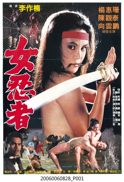 《女忍者》電影海報。本件保存良好,外觀清楚。海報上載明之電影資訊:導演:李作楠,主演:楊惠姍、陳觀泰、向雲鵬、甄琇莉、朴英蘭、金燕飛、金逸芳、曹健、張英頎、彭剛、孫榮吉、楊雄、戴徹、陳松勇、陳啓俊。本片描寫女主角拜師日本伊賀派忍者,成為第一位中國女忍者,聽聞老父被未婚夫所殺,趕回上海欲殺掉未婚夫替老父報仇,發現老父的死另有隱情。本片以武打片段與煽情成分為商業宣傳賣點。