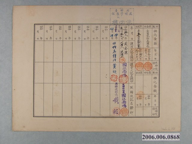 1.本物件為昭和16年1月29日周金源持有臺灣農產製粉株式會社之股份證明,其為橫式證書,上方有騎縫章,本證為乙第072號,該公司為臺灣農產製粉株式會社,登記設立時間為昭和16年1月29日,股份持有者為周金源,其投資股份10株,為500圓。本證發於昭和16年1月29日,臺灣農產製粉株式會社取締役社長黃欣;背面有讓渡人記名調印、讓受人記名調印以及取締役記明證印等變更紀錄。
