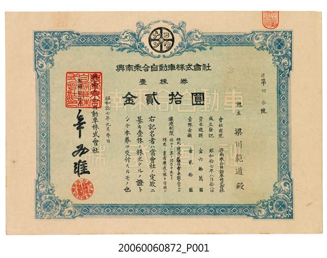 1.本物件為興南乘合自動車株式會社金(股票面額)貳拾圓(日圓),時間為昭和拾七年9月3日,株主為梁川範道,股票上印有會社商號、資本金額、設立登記時間等內容。