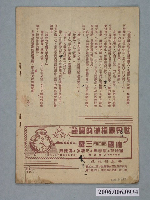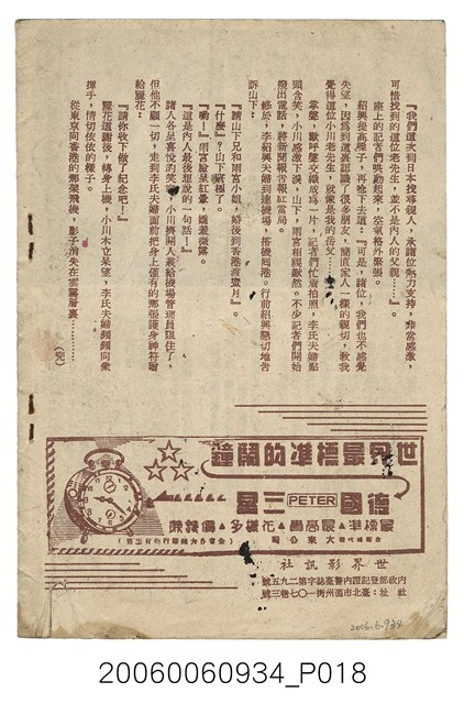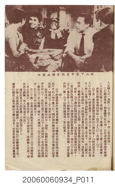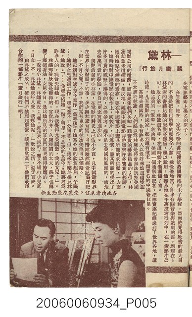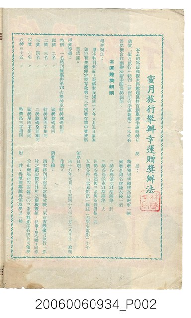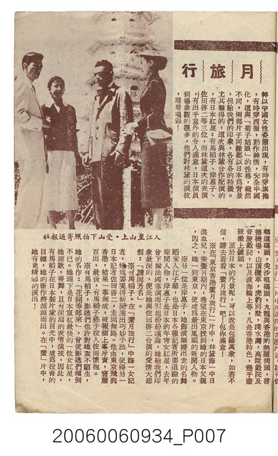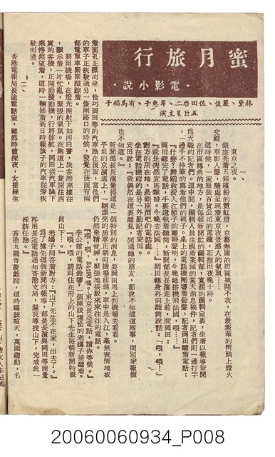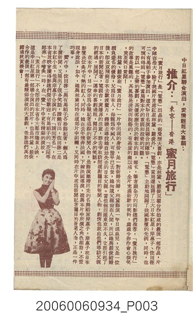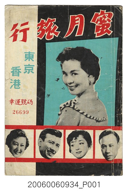 1. 本物件為中日合作之愛情喜劇電影《香港東京蜜月旅行》之特刊,其封面為主要演員林黛、嚴俊、岸惠子、有馬稻子、佐田啟二的照片。此特刊為提高觀眾的興趣,特別首次舉辦一次幸運贈獎活動,凡購買此《蜜月旅行》特刊者,均有得獎機會,而該幸運號碼則以紅色字體印於封面的左側。本刊的幸運號碼為26699。而其所載的內容,除了劇情簡介外,相關文章還有「影壇瑰寶-林黛,由林黛的崛起(?)》談《蜜月旅行》」、「從日本式生活談《蜜月旅行》」、「外景拍攝及其他」,最後一篇是《蜜月旅行》之電影小說,其中也刊載了多張劇照。2. 《香港東京蜜月旅行》由日本知名導演野村芳太郎執導,該片完成於1955年。該片於1957年在香港上映,1958年在臺灣上映。本片劇情講述女主角沈麗華,是一名頗負盛名的優伶,為中日混血兒。於李紹興結婚後,決定到日本度蜜月,藉機尋找失散多年的日籍父親。兩人抵達日本後,遇見日本記者雨宮啟子和山下俊介,雨宮獲悉沈麗華想要尋找,認為此事具有新聞價值,於是對此大肆報導,立即引起了日本媒體的關注,群去爭取訪問他們,造成無數的困擾。而劇情則在尋父的過程中,展開了一連串的喜劇事件。3.電影於1955年完成。根據本刊之贈獎活動之得獎辦法,推斷電影及雜誌發行年份應在民國47年(1958)。得獎辦法:憑本特刊封面上號碼,對民國四十八年元月五日臺灣銀行有獎簡便定期存款第七三次搖獎存單中獎號碼單為據。