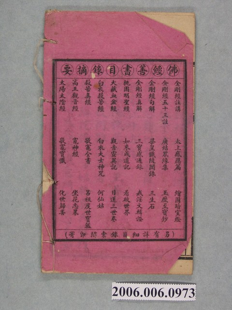 《大藏血盆經》,也稱為《女人血盆經》,在民間流傳甚廣,相傳婦女生育過多,會觸汙神佛,死後下地獄在血盆池中受苦,若生前延僧誦此經,則可消災錫福。本件據該書封面所示,為民國19年由上海佛經流通處印行,臺灣嘉義西市場前蘭記圖書部經售。書末有其他佛經的銷售目錄。