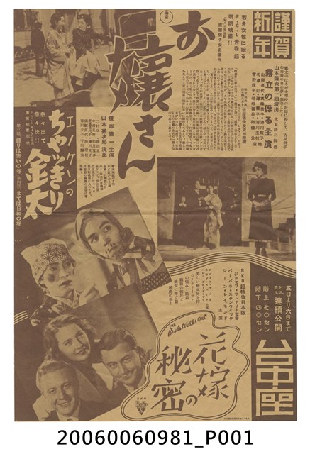 1.本物件為臺中座宣傳單,紙質文物。該物件上方可見「謹賀新年」4字、「お孃さん」宣傳廣告,其主演為「榎本健一」。左方為「ちヤツきリ金太」宣傳廣告。下方為「花嫁の秘密」宣傳廣告,右下角為可見「台中座」3字。