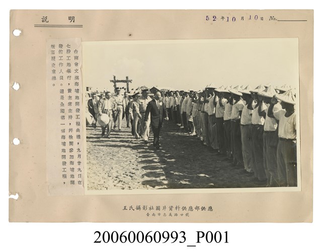 本物件為新聞照片,於嵌裝式打孔卡片中黏貼此照片,卡片上方有收錄日期為「52年10月10日」,照片中為檢閱開工人員,左列說明區貼有紙條說明:「台南曾文溪海埔地開發工程典禮,九月廿九日在七股工地舉行,黃主席主持,幷檢閱參加海埔地開發的工作人員。這是全國第一個海埔地開發工程,極富歷史意義」,照片下方列有「王氏攝影社圖片資料供應部供應」,下方並列該社地址「臺南市忠義路廿號」。