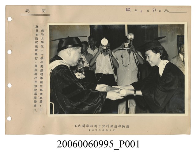 本件為成功大學51學年度畢業典禮照,拍攝時間為民國52年(1963)6月15日,由臺南市王氏攝影社圖片資料供應部提供。照片左側印有以下文字說明:「成功大學五十一學年度應屆畢業生畢業典禮,十五日在該校隆重舉行,閻振興校長頒發畢業證書。」