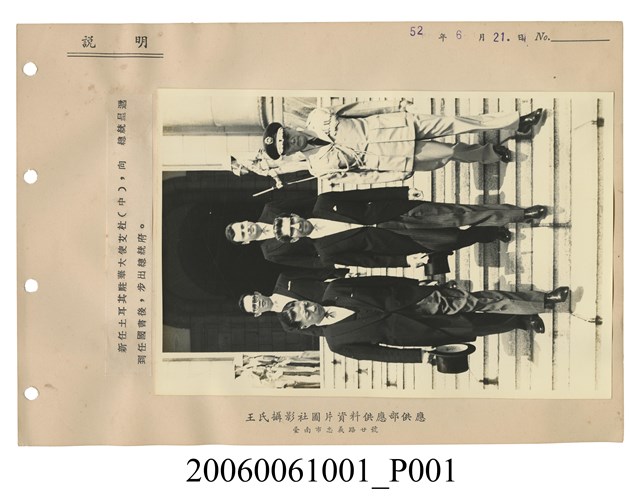 此物件為照片檔案,相片上方印有文字說明,右側列有日期(1963年6月21日)及編號,左側註記相片來源。 此物件記錄了新任土耳其大使愛杜(Turgut Aytuğ)在1963年5月31日赴總統府呈遞到任國書之場景,此位大使於1966年11月離職。中華民國與土耳其的外交關係,始於1934年4月4日,後在戰後因土耳其政府在冷戰時期維持反共立場,而持續外交關係直到1971年8月土耳其與中華人民共和國建交之後。 臺灣於戰後的外交在「臺灣中立宣言」、「臺美共同防禦條約」、「福爾摩沙決議」,這些美國對臺政策防止中國共產黨政府以武力攻佔臺灣,同時也限制在臺灣的國民黨政府難以反攻中國大陸。在此情勢之下,臺灣以積極外交手段鞏固地位,主要策略首先為以「反共抗俄」為號召積極加入或創建反共的國際聯盟組織,如「世界道德重整會」、「亞洲人民反共聯盟」,後在1960年代更是貫徹經營反共組織的策略,例如將「亞洲人民反共聯盟」改為「世界反共聯盟」,其次以自身經貿、加工出口、農業技術的產業優勢,與眾多國家展開邦交,再者進行選美活動如「中國小姐」選拔來提升能見度。這些策略直到臺美斷交以及臺灣退出聯合國後產生變化。