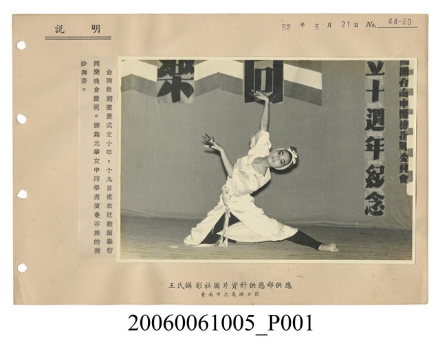 此物件為照片檔案,相片右上角列有日期(1963年5月21日)及編號(44-20),左側印有文字說明,下方註記相片來源。此照片內容為臺南救國團成立十年的相關照片。 「中國青年反共救國團」於1952年,中國國民黨基於「反共復國」之需要而成立,其前身為「三民主義青年團」及「中國青年反共抗俄聯合會」。在該年3月29日,蔣中正於青年節中發布〈告全國青年書〉,宣布要成立救國團,而在5月31日行政院制定「中國青年反共救國團籌組原則」,訂定救國團隸屬於國防部總政治部,為官方的「青年團體」。救國團本部設於臺北,各縣市設有支部跟青年活動中心,所屬單位有學苑、張老師中心、中國青年服務社、幼獅文化事業股份有限公司等,組織活動包含:實施學校軍訓、推行政令、整理戶籍、擔任教育、地方自治、土地行政、青年寒暑訓等活動、編輯教科書及出版事業等(李泰翰,2014。6)。