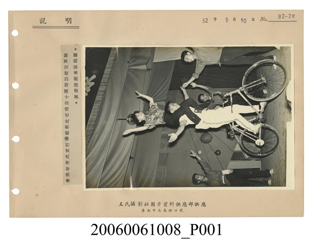 本物件為陸軍官校訪問團在社教館舉行文武青年晚會,期間表演的新聞照片,照片為特技表演,1名女性坐於1名騎乘腳踏車的男性肩膀上,兩人雙手皆高舉,周圍則有幾名男子雙手高舉圍繞。