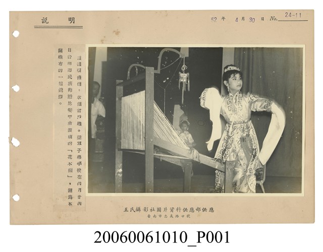 1.新聞照片剪貼,橫式版型,為活頁孔裝訂形式,頁面印有「說明」、「年月日no.」、「王氏攝影社圖片資料供應部」、「臺南市忠義路廿號」字樣,日期52年4月30日No.24-11為手寫,黑白新聞照片和說明文字為剪貼黏上。畫面主要呈現小女孩著古裝,在織布機前揮舞長袖、跳舞的場景。2.「台南市民族舞蹈比賽中表演『花木蘭』」1963年4月24日空軍子弟學校在臺南市民族舞蹈比賽中表演「花木蘭」。