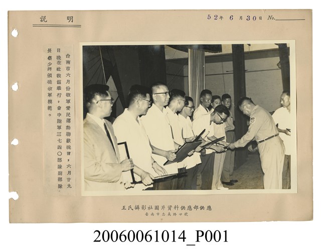本物件為陸軍3740部隊副部隊長蔡少將於臺南市6月份敬軍愛民運動聯歡晚會上,頒獎敬軍模範的新聞照片,照片中8名男子身著襯衫及西裝褲排成一列等待受獎,蔡少將身著軍服正將手中獎狀頒發給其中一名男子。