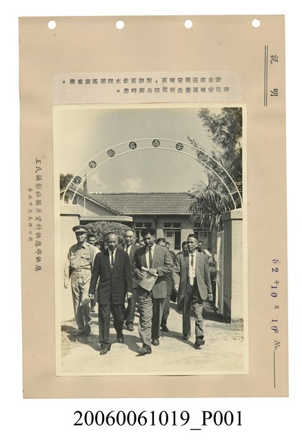 本物件為民國52年黃主席巡視安南區並往衛公所慰問烏腳病患照片。此為黑白照片,照片黏在一張紙上,紙上有照片說明、照片供應商和日期(應為沖洗日期)。照片中一行人西裝筆挺,有一位警察陪同一起步出安南區衛生所大門。照片說明為,黃主席巡視安南區,對該區飲水問題甚表重視,並往安南區衛公所慰問烏腳病患。