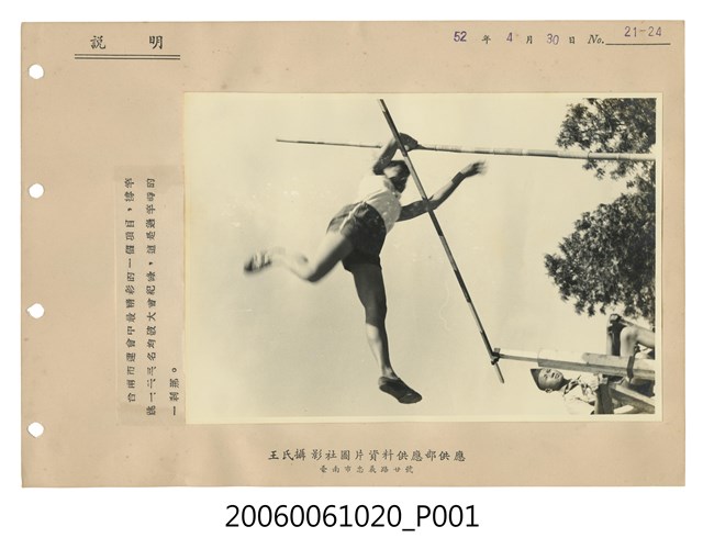 本物件為臺南市運會中最精彩的一個項目之撐竿跳,照片中為撐竿跳選手藉由竿子,越過橫桿的一瞬間,一旁有1位裁判坐於高椅之上,照片貼於紙卡中央,紙卡左側有4個穿孔可收集成冊,左上有「說明」黑色字樣,照片左方黏貼1張紙條書寫「台南市運會中最精彩的一個項目,撐竿跳一、二、三、名均破大會紀錄,這是過竿時的一剎那。」字樣,右上以印刷及蓋章方式書寫「52年4月30日 No. 21-24 」字樣,下方有「王氏攝影社圖片資料供應部供應 臺南市忠義路廿號字樣」黑色字樣。