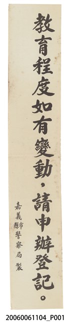 本件嘉義縣市警察局製「教育程度如有變動,請申辦登記。」的直式長方形標語為白紙黑字印刷,中間有摺痕,紙張泛黃,大致保存良好。