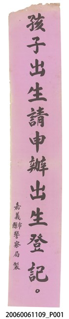 本文物為嘉義縣市警察局「孩子出生請申辦出生登記」標語,紅底,以毛筆字體寫有「收孩子出生請申辦出生登記」之字樣。出生登記為政府掌握人口的方式之一,相較於日治時期戶政人員查戶口時才能被動地掌握人數,出生登記由新生兒的父母主動至申請地辦理。