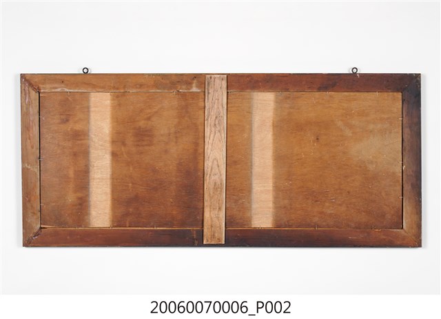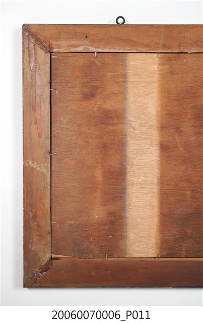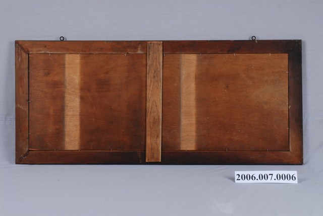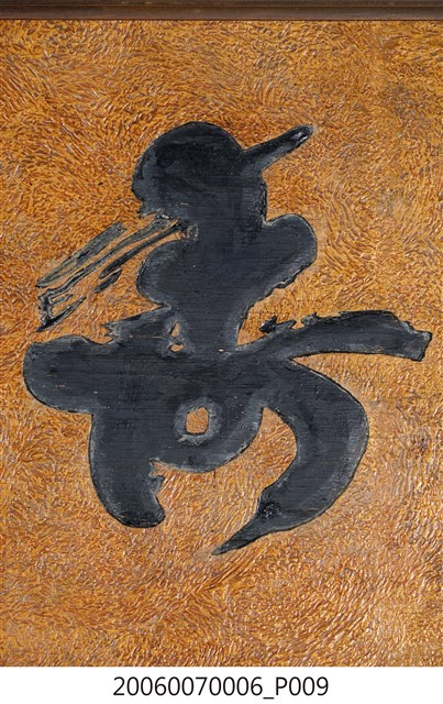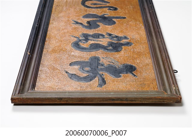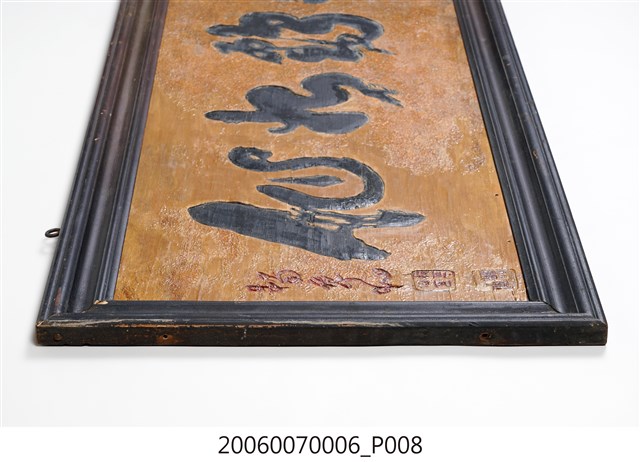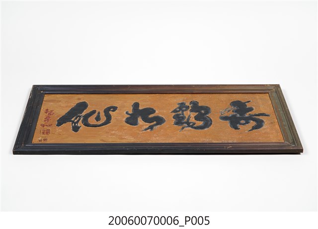 1.本件為楊草仙書「壽齡如仙」匾,匾額為金地墨書木匾,無上款,中央為橫書匾文「壽齡如仙」,下款朱文書寫作者「楊草仙」之名,另有「楊草仙印」、「草仙」落款印章二枚,文字皆以草書寫成。匾額主體以一塊木板製成,四周做方框,背面可見過去匾額的裝裱之痕跡,現以一塊木板加固,可見此匾後來經過重新修整。