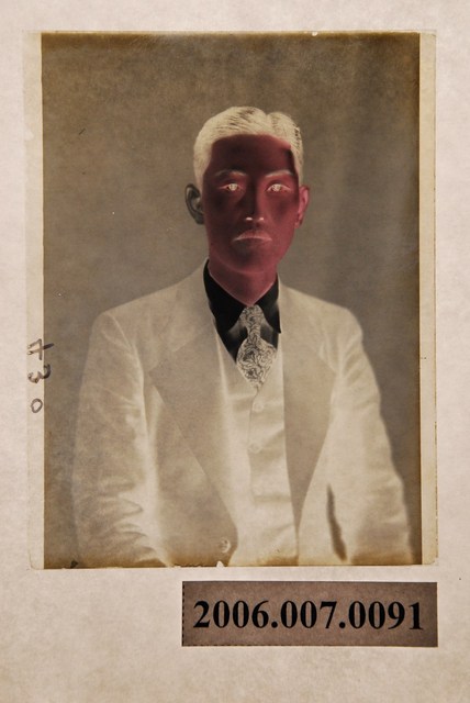 1. 這張乾板保存良好,四周有些許的褪色汙垢,人物臉部有仔細地加工塗紅。側邊有手寫數字編號430。2.影像內容是一位男子身穿西裝打領帶的半身近身照。男子梳西裝頭,耳朵外露,直視前方。他身穿西裝外套、背心、打領帶,領帶圖案有花朵樣式。3.「塗紅」,玻板時代的感光乳劑對紅棕色感光力低,因此人臉或皮膚會顯得暗沉,為了還原底片中景物或人物的明暗度,進而發展出人工修整的技巧,就是在黑白底片上,將景物局部塗上紅墨水,再利用淡色的紅墨水塗層可以減少印製相片時的曝光量,因此得到白皙的皮膚效果,讓沖洗出的照片更加真實並美化,且能使景物更加立體。直至1960年代,都還有相館使用這種方法。