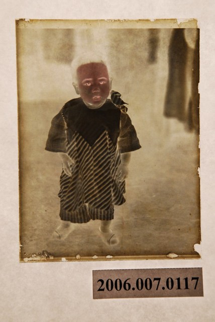 1.這張玻板的藥膜面,在上方左邊的藥膜剝落與反翹的地方可以發現藥膜邊緣凸出玻璃板邊緣。玻板四周有細細一圈的變色,上邊與下邊有一些藥膜剝落的現象,全張玻板保存良好。人物臉部有加工塗紅。這張底片拍攝環境的光線可能是陰天或室內,因此使用了大的光圈拍照,景深很深,背景非常模糊。2.影像內容是一位小男孩站著的全身照。小男孩的頭髮為平頭。小男孩穿的是多層次穿著,上衣中間部份素面無圖案,袖子寬長,下半身為粗線條的長褲,腳穿著鞋踏在平地上。3.「塗紅」,玻板時代的感光乳劑對紅棕色感光力低,因此人臉或皮膚會顯得暗沉,為了還原底片中景物或人物的明暗度,進而發展出人工修整的技巧,就是在黑白底片上,將景物局部塗上紅墨水,再利用淡色的紅墨水塗層可以減少印製相片時的曝光量,因此得到白皙的皮膚效果,讓沖洗出的照片更加真實並美化,且能使景物更加立體。直至1960年代,都還有相館使用這種方法。