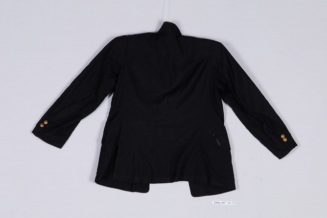 本件為日治時期學生制服上衣,黑色長袖,發行時間不詳,由臺南市八幡洋服店製造(地址為臺南市本町3-98號)。材質推測為棉質,正面左右下方置2個口袋,上衣正面置鈕扣5個,應為金屬製,鈕扣正面印有櫻花圖樣,袖後左右各有2顆金屬袖釦。日治時期的各級學校制服,多交由學校自行辦理,未見統一樣式之規定。根據大正13年(1924)公布的「臺灣總督府臺北師範學校服制」,與此服制類似,可供參考,其規定為:「質料為黑陵小倉織(黑色棉質),製式為立領外套式,左、右下方各置口袋一個,鈕扣尺寸為6分5厘(約2公分),置5個,鈕扣表面印上櫻花狀,前胸(襟)部分應配上與年級徽章。」