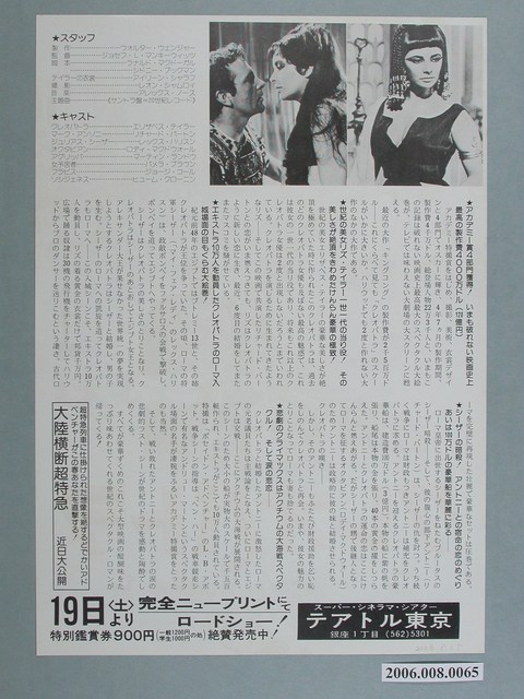 本物件為《埃及豔后》電影宣傳單,紙質文物。該宣傳單主要設計為頭戴皇冠之女主角特寫、場景劇照。下方可見「クレオパトラ」日文字。內頁為主要工作人員名單及劇情介紹。