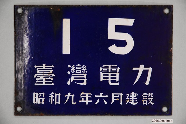 1.本物件是1個由金屬製成的方形牌子,4個角皆有1個圓形小洞,正面背面皆漆上深藍色底漆,並有漆上白色文字,其分成3個部分,為「15」、「臺灣電力」、「昭和9年6月建設」,反面亦漆上相同文字,正面除邊框稍有生鏽,白色文字稍微染上生鏽,背面的左邊邊框生鏽嚴重,其他部分也比正面生鏽及毀損地方較多。