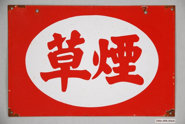 本物件為煙草鐵牌,為鐵製品,為長方形,底色為紅色,邊緣為白色邊框,中央有白色橢圓形圖案,內有「菸草」紅色字樣,背面與正面相同,鐵牌上方有2個藍色孔洞,可供繩線穿過懸掛使用,物件四角處有鏽蝕及崩脫情形。