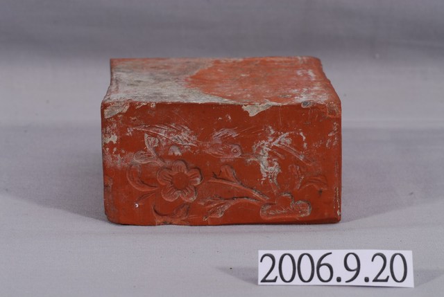 1.本件囍磚為四方形磚,一邊刻有囍字,另一邊則刻花鳥圖,通常做為壓箱之用。紅磚頂層有灰白痕跡,側邊則有黑色痕跡。2.婚禮時,南部地區通常會先在迎娶前派人送來新娘的兩箱衣物,一箱裝衣服,一箱裝裙褲,結婚當天,新郎新娘入洞房後,夫妻合吃湯圓、甜茶後,便會進行開箱儀式,以預卜未來先生男或生女,如先開啟衣服一箱則會先生子,媒婆也會在旁邊說吉祥話。