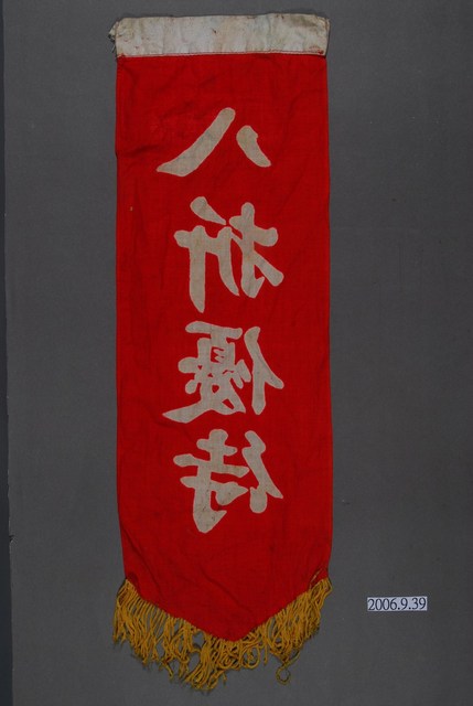 1.本件八折優待單面布旗為布面質料,採單面印刷,背面透印成左右相反字體,呈長17.7公分,寬44.5公分,高1公分,外觀為直式長方形,底緣處作兩側斜切成三角形,並帶有黃色流蘇裝飾。布旗以紅色為底色,中央處採直式印有白色「八折優待」字樣。2.該布旗頂緣處帶有白色布桿套,可穿入繩索或桿子,主要為糕餅店於中秋節期間懸掛牆面,除作宣傳廣告之用,也具有商品販售品項展示的功能。登錄號2006.009.0035到2006.009.0056之藏品應為成組關係。