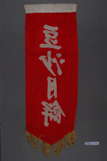 1.本件豆沙月餅單面布旗為布面質料,採單面印刷,背面透印成左右相反字體,呈長18公分,寬49.6公分,高0.4公分,外觀為直式長方形,底緣處作兩側斜切成三角形,並帶有黃色流蘇裝飾。布旗以紅色為底色,中央處採直式印有白色「豆沙月餅」字樣。2.該布旗頂緣處帶有白色布桿套,可穿入繩索或桿子,主要為糕餅店於中秋節期間懸掛牆面,除作宣傳廣告之用,也具有商品販售品項展示的功能。登錄號2006.009.0035到2006.009.0056之藏品應為成組關係。
