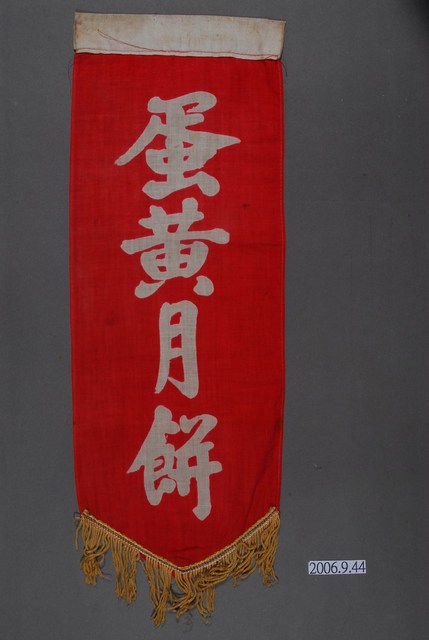 1.本件蛋黃月餅單面布旗為布面質料,採單面印刷,背面透印成左右相反字體,呈長16.9公分,寬49公分,高0.3公分,外觀為直式長方形,底緣處作兩側斜切成三角形,並帶有黃色流蘇裝飾。布旗以紅色為底色,中央處採直式印有白色「蛋黃月餅」字樣。2.該布旗頂緣處帶有白色布桿套,可穿入繩索或桿子,主要為糕餅店於中秋節期間懸掛牆面,除作宣傳廣告之用,也具有商品販售品項展示的功能。登錄號2006.009.0035到2006.009.0044之藏品應為成組關係。