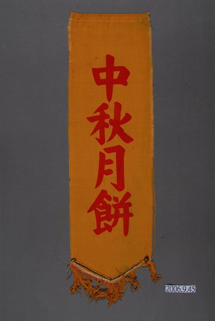1.本件中秋月餅單面布旗為布面質料,採單面印刷,背面透印成左右相反字體,呈長12.8公分,寬44.9公分,高0.4公分,外觀為直式長方形,底緣處作兩側斜切成三角形,並帶有黃色流蘇裝飾。布旗以黃色為底色,中央處採直式印有紅色「中秋月餅」字樣。2.該布旗頂緣處縫製有布桿套,可穿入繩索或桿子,主要為糕餅店於中秋節期間懸掛牆面,除作宣傳廣告之用,也具有商品販售品項展示的功能。登錄號2006.009.0045到2006.009.0056之藏品應為成組關係。