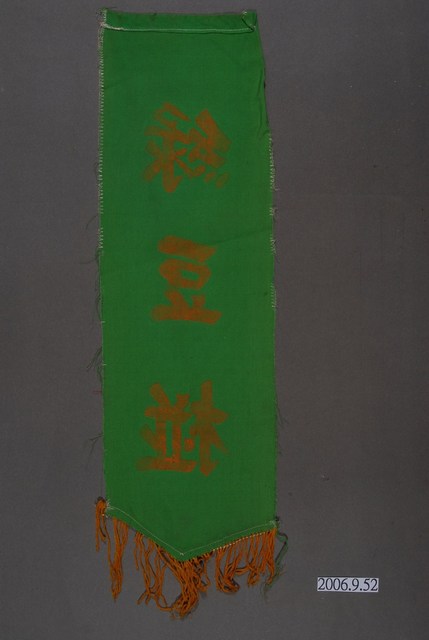1.本件綠豆椪單面布旗為布面質料,採單面印刷,背面透印成左右相反字體,呈長13.6公分,寬45.5公分,高0.3公分,外觀為直式長方形,底緣處作兩側斜切成三角形,並帶有黃色流蘇裝飾。布旗以綠色為底色,中央處採直式印有橘色「綠豆椪」字樣。2.該布旗頂緣處縫製有布桿套,可穿入繩索或桿子,主要為糕餅店於中秋節期間懸掛牆面,除作宣傳廣告之用,也具有商品販售品項展示的功能。登錄號2006.009.0045到2006.009.0056之藏品應為成組關係。
