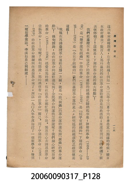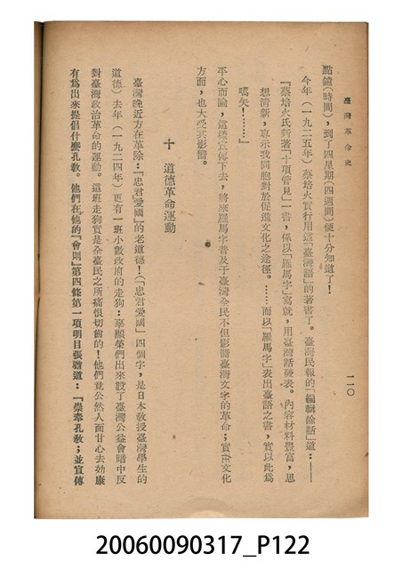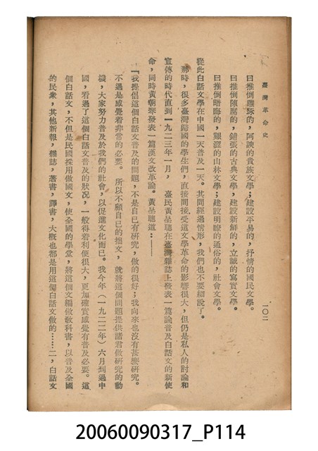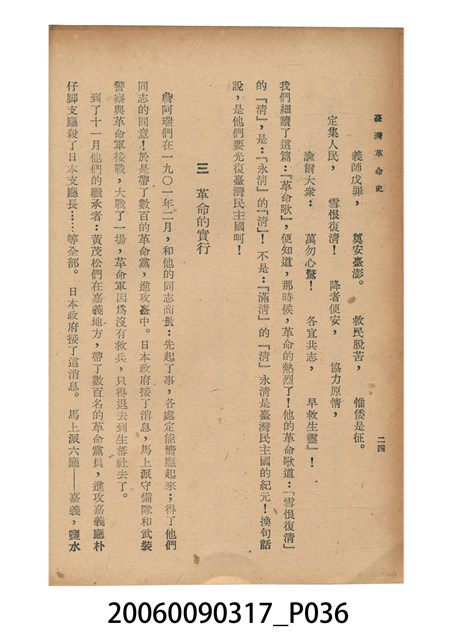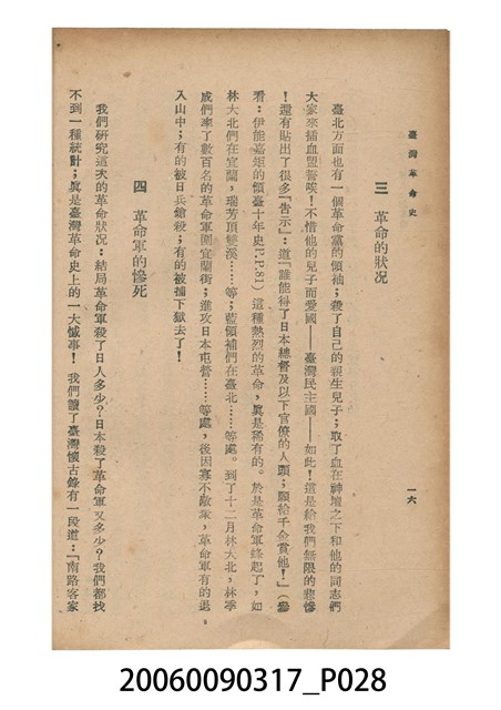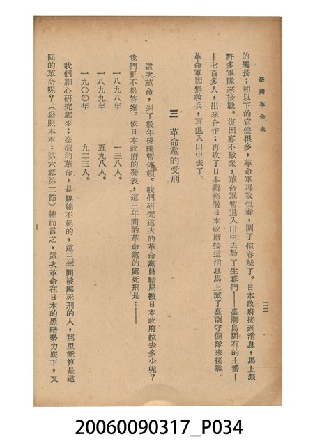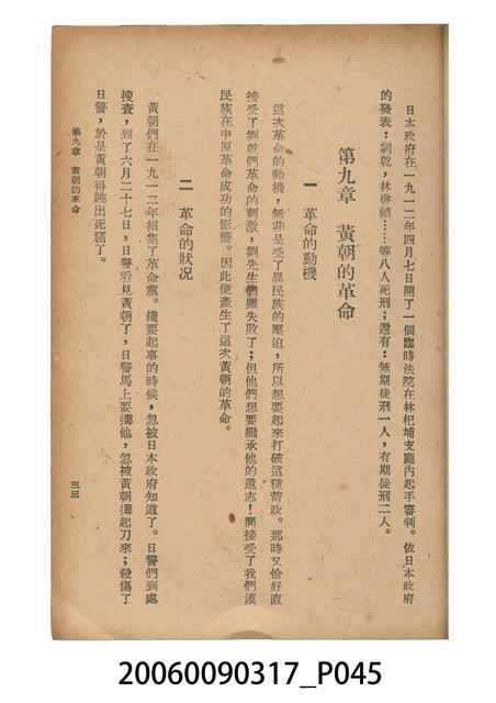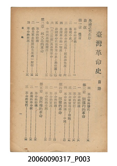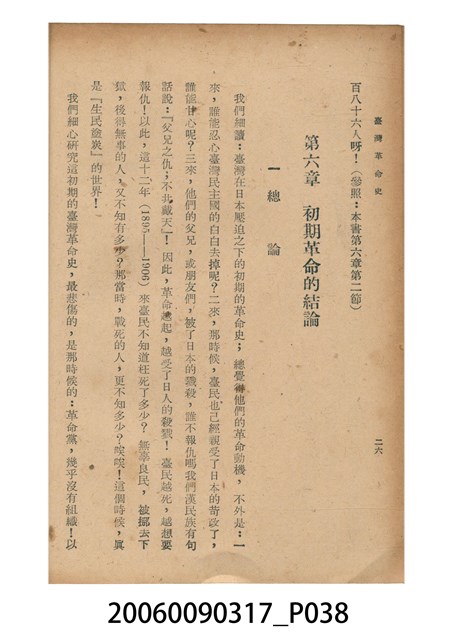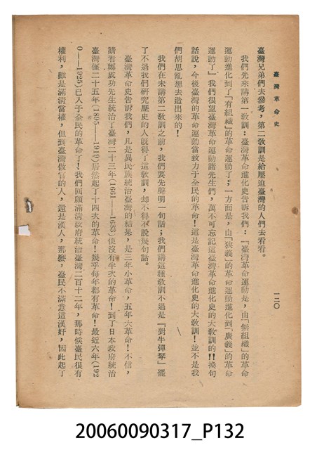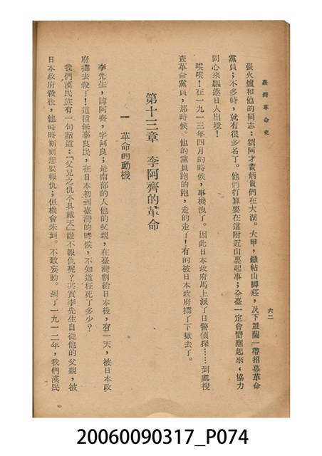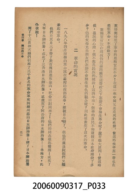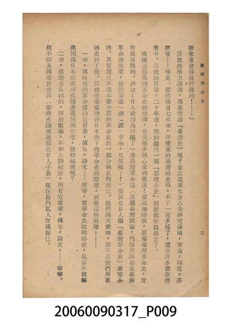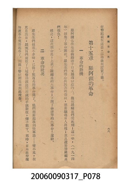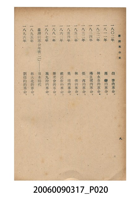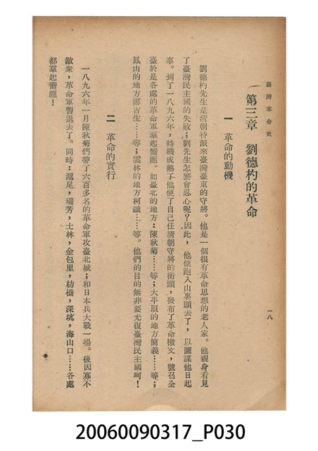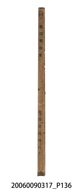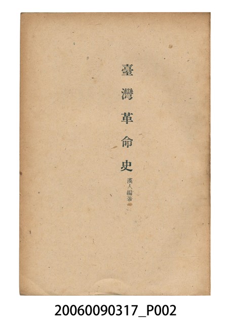 此為一紙質書籍,為一講述日治時期臺灣歷史書籍,名為《臺灣革命史》 本書為筆名漢人的黃玉齋於1925年創作的《臺灣革命史》,黃玉齋完成此書時為廈門大學學生,為了避嫌依此化名為「漢人」,黃玉齋曾自述撰寫此書時為躲避日本追查,只得在放假回臺灣時,前往臺灣總督府臺北圖書館抄譯日人記載的臺灣抗日史料,且為害怕帶入家中,因此每抄寫完便將抄本直接寄送廈門的友人,以利日後撰寫。作者黃玉齋致力於臺灣史的撰寫,對臺灣明鄭時期至日治時期的研究有著重大貢獻,曾擔任臺灣省通志館的編輯委員。 在1895年的甲午戰爭之後,清朝朝廷依「馬關條約」將臺灣割讓給日本,於是日本在當年6月便派出軍隊接收臺灣,臺灣島上的清朝遺民於是展開對日本統治的抵抗,以唐景崧與劉永福為首的臺灣仕紳成立臺灣民主國,但最終兵敗,兩者也逃回中國。後臺灣便持續展開對日本的武裝抵抗,日本方面最初以強硬的武力手段應對反抗勢力,但其後便以經濟與政治手段來攏絡控制民間、招安反抗軍的方式逐步掌握臺灣,以抹平反抗勢力,最終在1915年的「西來庵事件」過後,臺灣除了1930年的霧社事件之外,便再也沒有武裝抗日活動。於是臺灣民間轉而以社會運動的方式爭取權力,臺灣的仕紳展開各種活動,其中「六三法撤廢運動」、「臺灣議會設置請願運動」、「臺灣文化協會」及「《臺灣民報》的發刊」最有影響力。