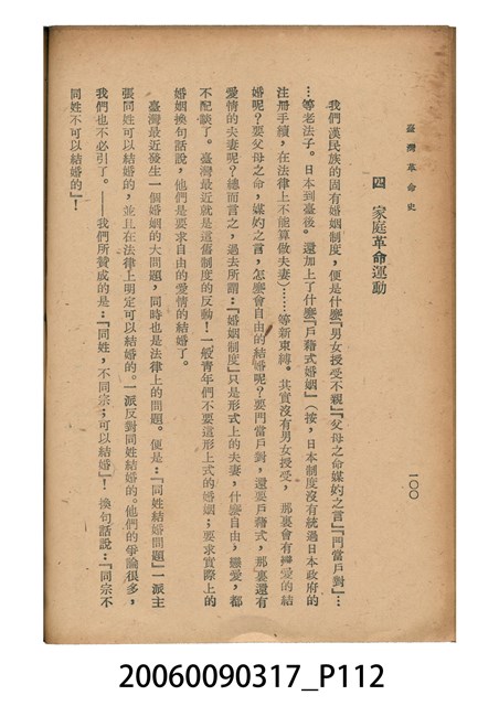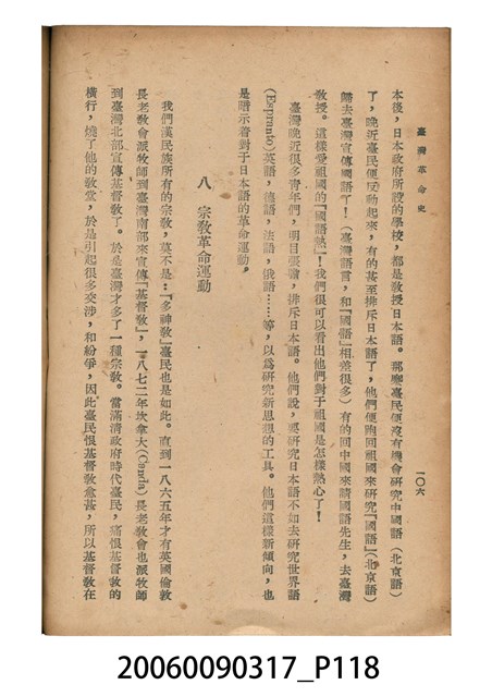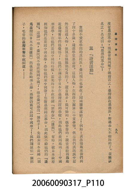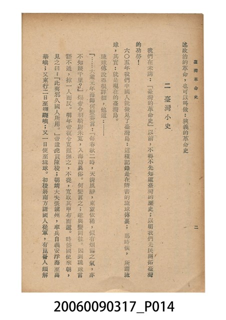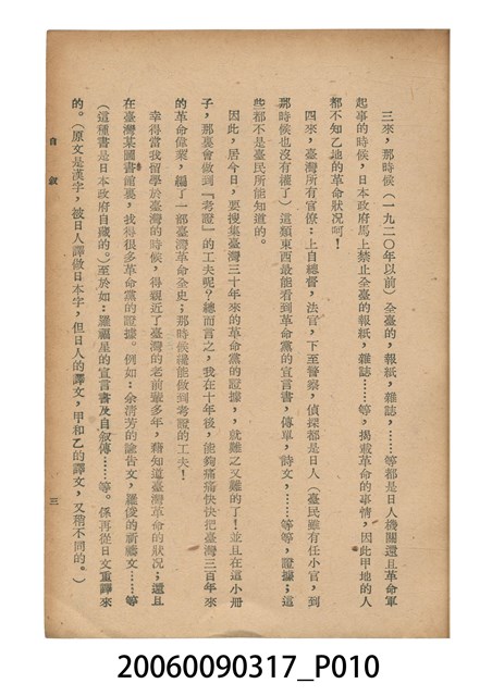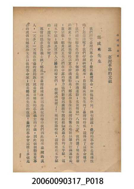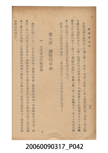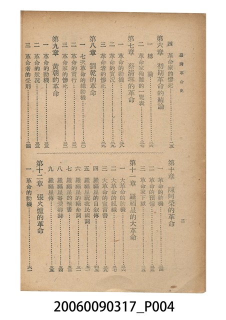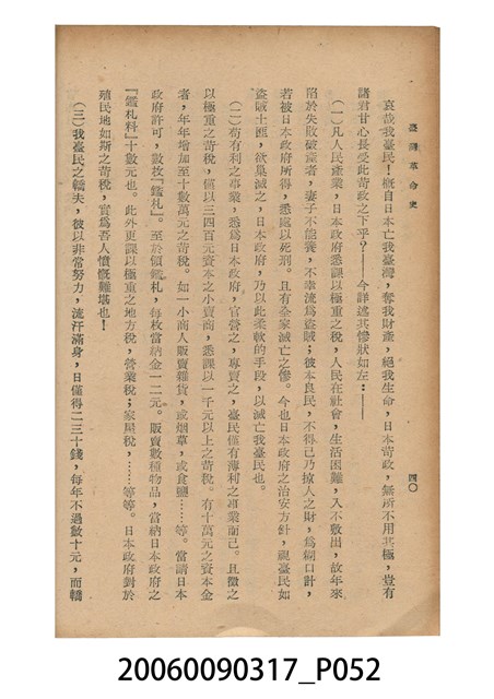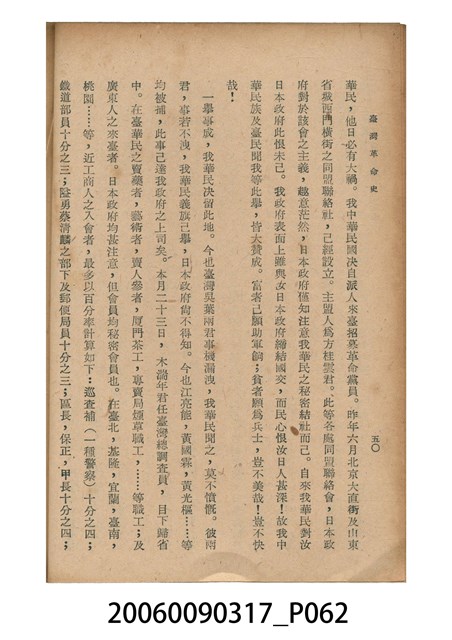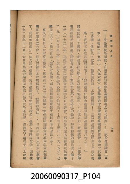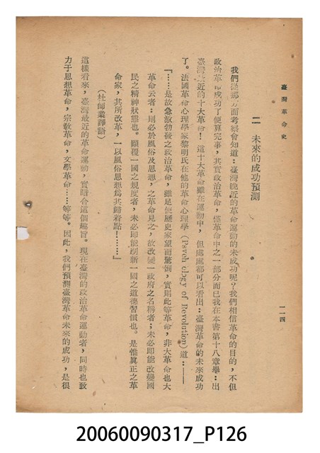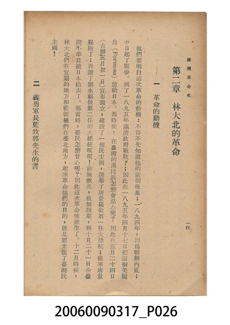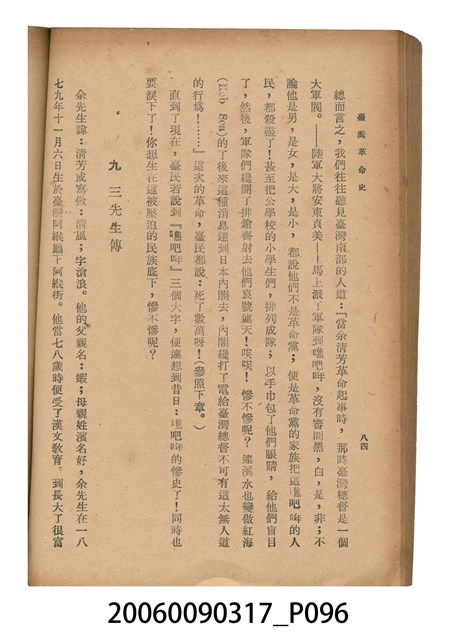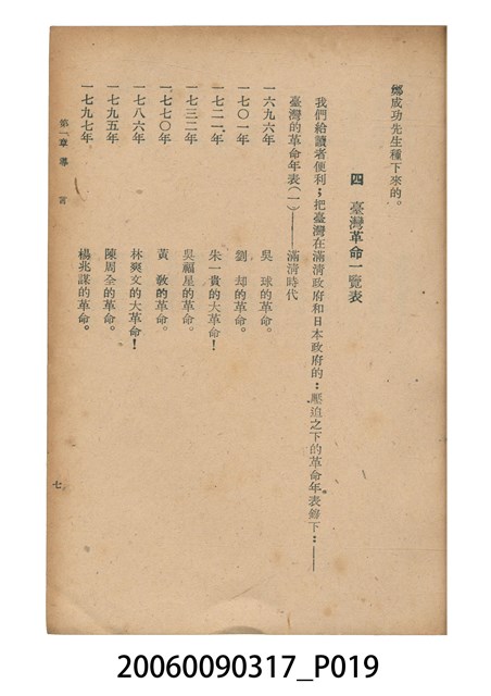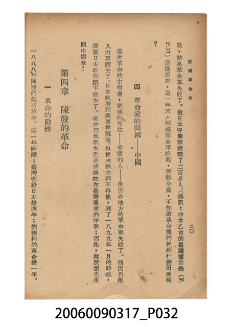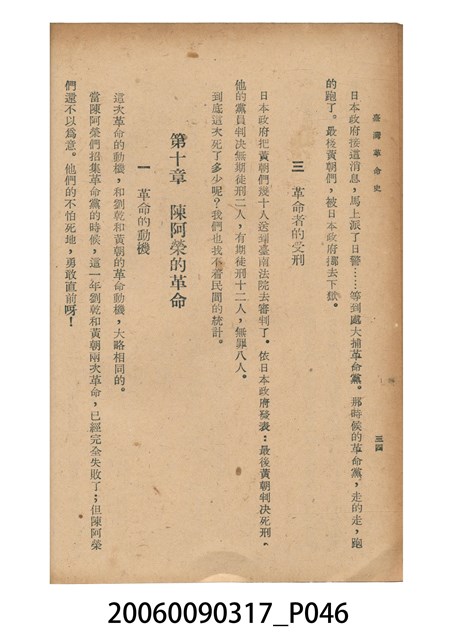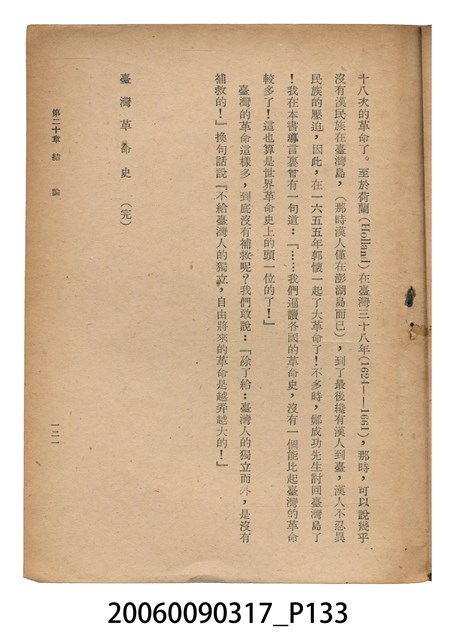 此為一紙質書籍,為一講述日治時期臺灣歷史書籍,名為《臺灣革命史》 本書為筆名漢人的黃玉齋於1925年創作的《臺灣革命史》,黃玉齋完成此書時為廈門大學學生,為了避嫌依此化名為「漢人」,黃玉齋曾自述撰寫此書時為躲避日本追查,只得在放假回臺灣時,前往臺灣總督府臺北圖書館抄譯日人記載的臺灣抗日史料,且為害怕帶入家中,因此每抄寫完便將抄本直接寄送廈門的友人,以利日後撰寫。作者黃玉齋致力於臺灣史的撰寫,對臺灣明鄭時期至日治時期的研究有著重大貢獻,曾擔任臺灣省通志館的編輯委員。 在1895年的甲午戰爭之後,清朝朝廷依「馬關條約」將臺灣割讓給日本,於是日本在當年6月便派出軍隊接收臺灣,臺灣島上的清朝遺民於是展開對日本統治的抵抗,以唐景崧與劉永福為首的臺灣仕紳成立臺灣民主國,但最終兵敗,兩者也逃回中國。後臺灣便持續展開對日本的武裝抵抗,日本方面最初以強硬的武力手段應對反抗勢力,但其後便以經濟與政治手段來攏絡控制民間、招安反抗軍的方式逐步掌握臺灣,以抹平反抗勢力,最終在1915年的「西來庵事件」過後,臺灣除了1930年的霧社事件之外,便再也沒有武裝抗日活動。於是臺灣民間轉而以社會運動的方式爭取權力,臺灣的仕紳展開各種活動,其中「六三法撤廢運動」、「臺灣議會設置請願運動」、「臺灣文化協會」及「《臺灣民報》的發刊」最有影響力。